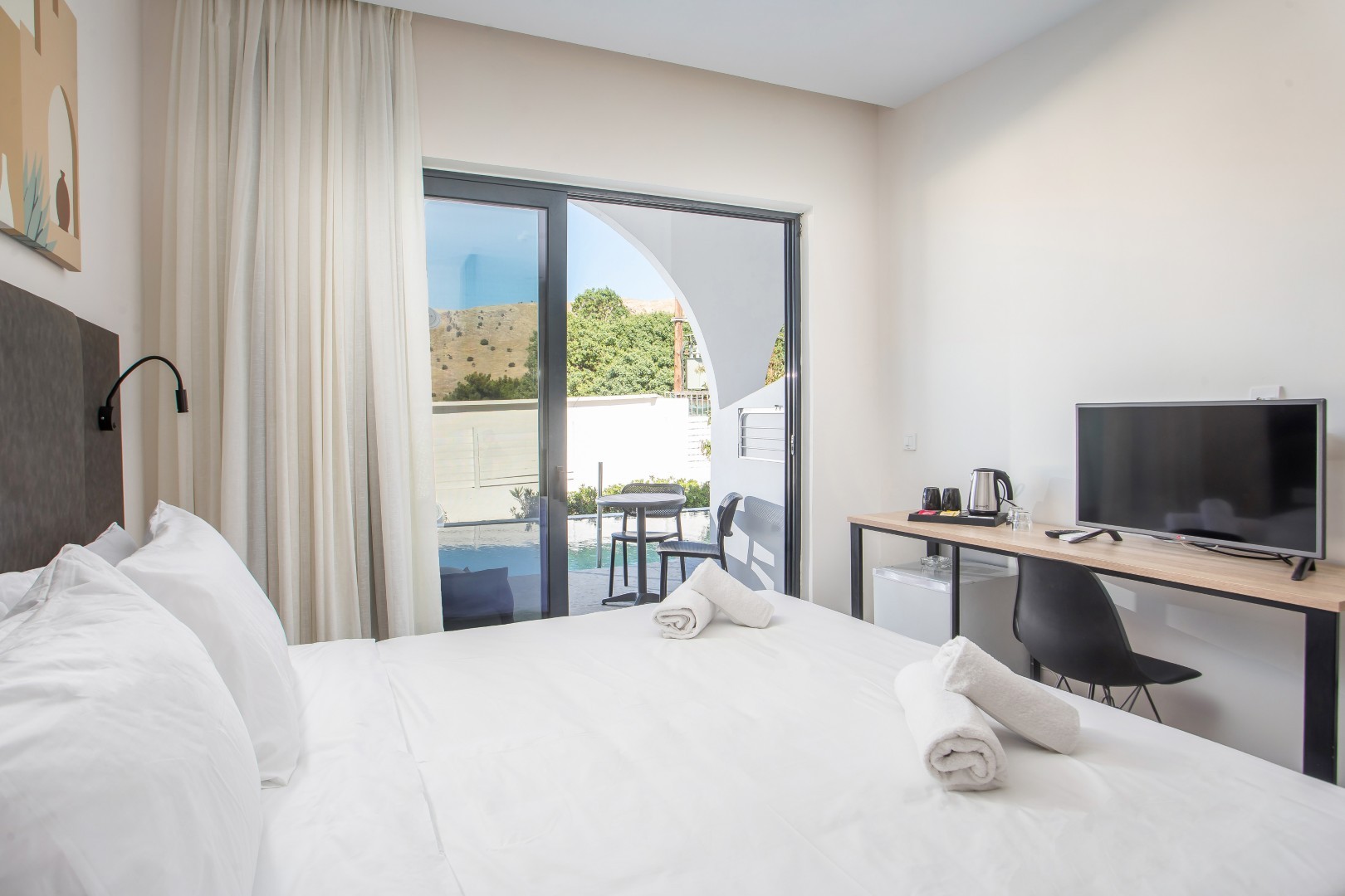Our Double Superiors with Shared Pool are modern decorated with attention to detail, light-filled rooms and they offer complementary amenity pack along with luxury bed linen and towel, individually controlled A/C, 32’ LED Satellite TV with international Channels, open wardrobe, cosmetic mirror, desk, free Wifi, Complementary coffee/tea making facilities, fully stocked Mini Bar*, Hair Dryer, Safety Deposit Box and a large, fully furnished, balcony or terrace overlooking the landscaped hotel’s garden or the hills.