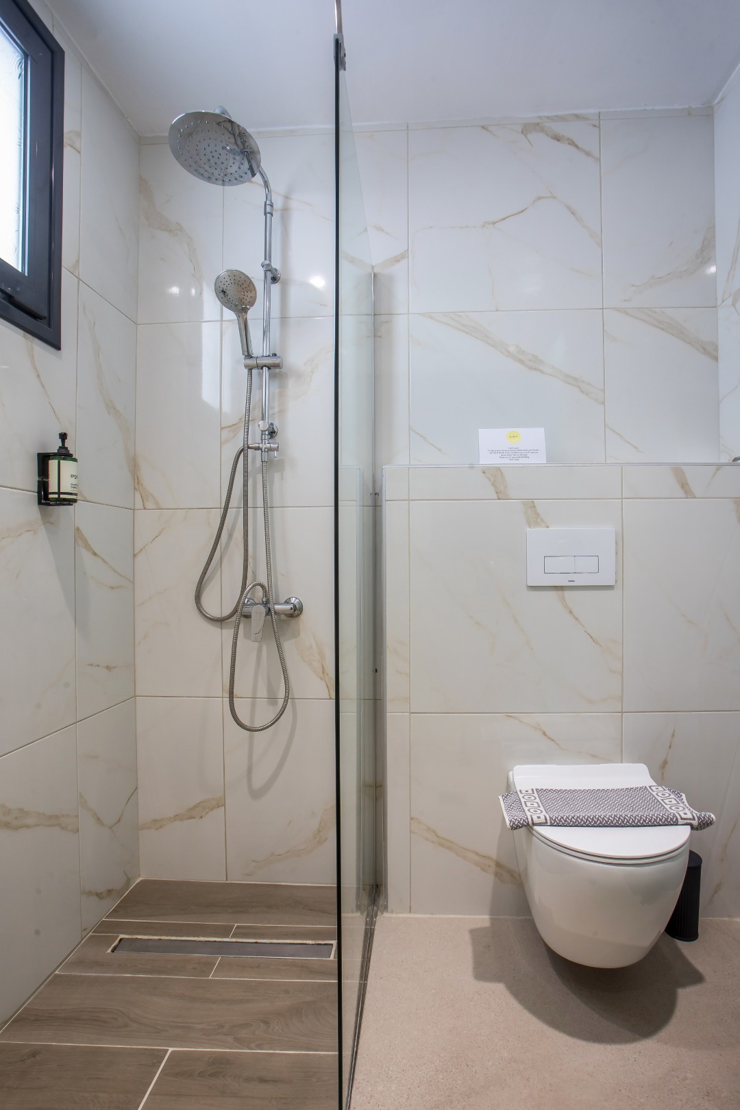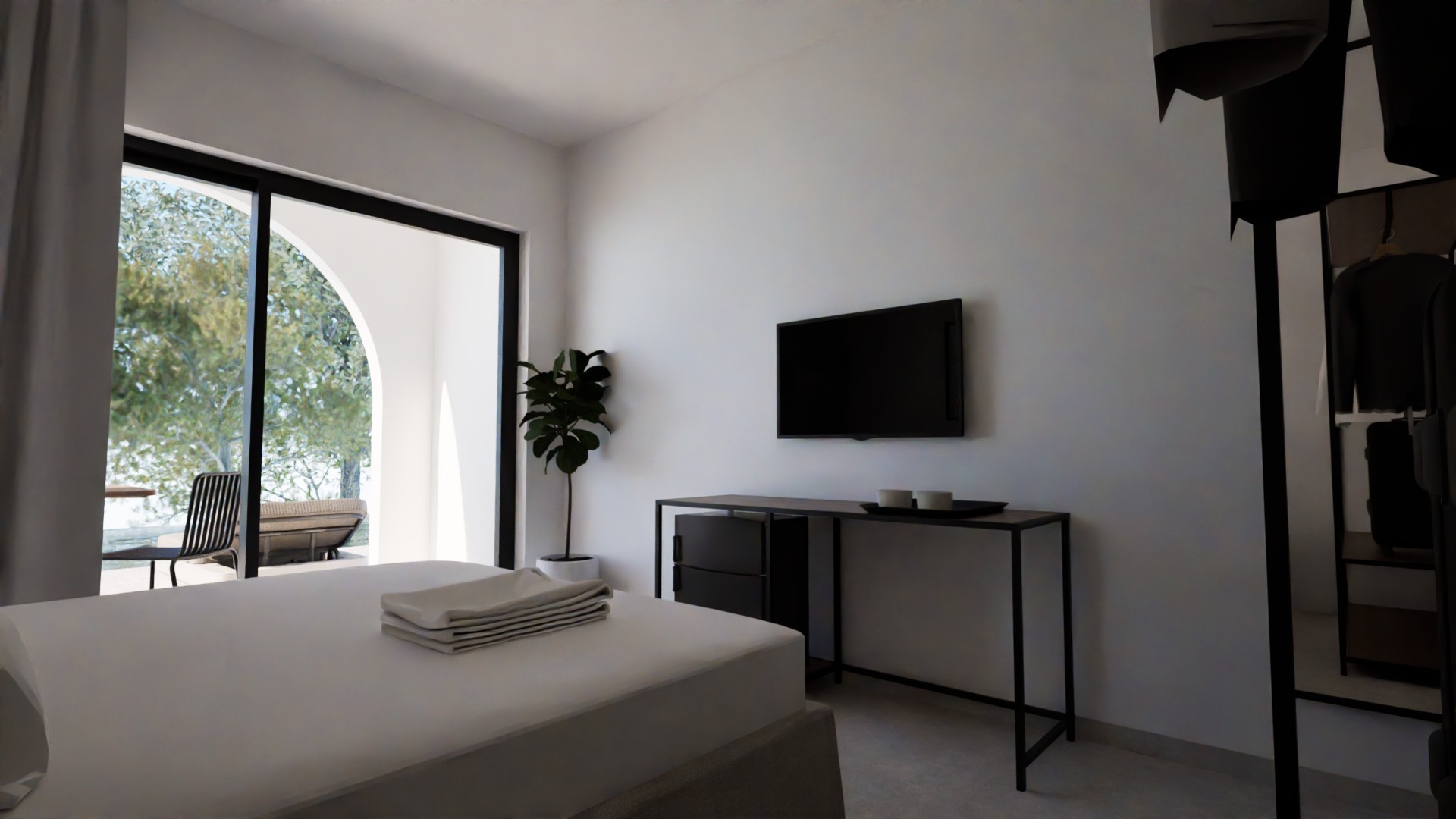 They are consisted of a sleeping area with a king-sized bed and a high-quality anatomical mattress, an en suite modern bathroom with walk-in shower and a large fully furnished terrace with direct access to a fresh water shared pool!